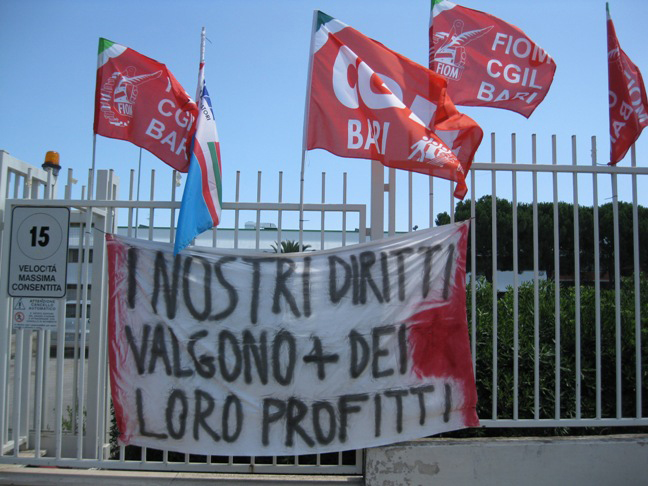 Giovanni: Anche i preti non sono mancati. Anche loro ci hanno esortato a stare tranquilli, perché così tutto sarebbe andato a posto. L’arcivescovo di Bari, monsignor Cacucci, ha lodato pubblicamente l’accordo di gennaio scorso fra la Kion e la Frazer Nash, poi andato a finire male. Durante la messa officiata nel piazzale della Bridgestone il giorno di Pasqua, ha invitato gli operai di quella fabbrica ad avere fiducia nei loro padroni e nelle loro rappresentanze sindacali perché sicuramente avrebbero trovato una soluzione al loro problema, così come era accaduto all’Om. Peccato che solo pochi giorni dopo l’accordo alla Om è svanito come una bolla di sapone. Cercano tutti di tenerci buoni, e non abbiamo fatto niente, noi operai. Hanno paura di noi? Figuriamoci se avessimo veramente alzato la testa.