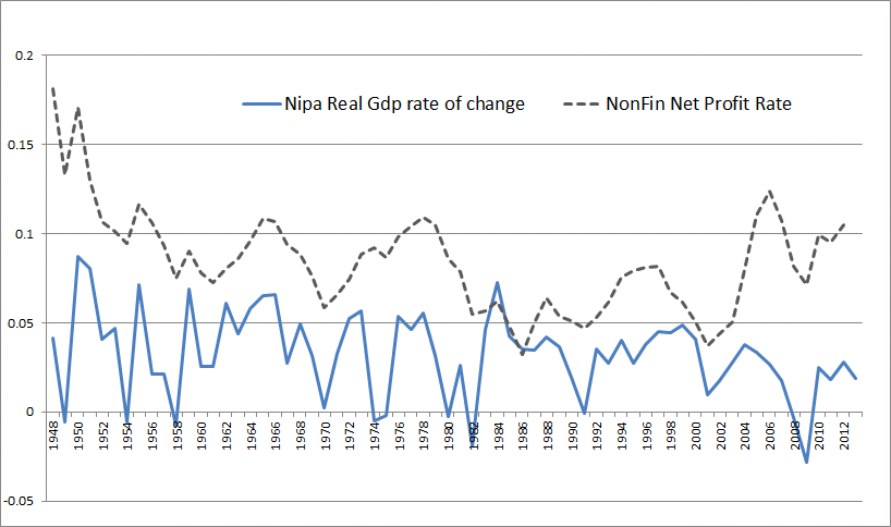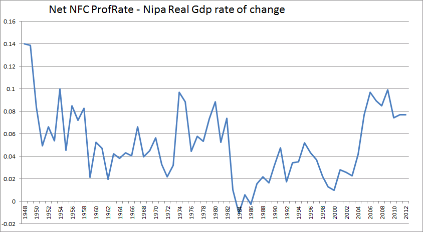 PS Per chi fosse interessato qui sotto (Fig.1) ci sono l’andamento del saggio netto del profitto delle corporation non finanziarie (linea tratteggiata) e l’andamento del saggio annuale di variazione del Pil reale (linea continua). Come si vede il saggio del profitto è sempre stato superiore al saggio di variazione del Pil (tranne in due anni nella seconda metà degli anni ‘80) e se avessimo preso il saggio lordo la differenza sarebbe stata assai più grossa. Quello che varia è la differenza fra il saggio del profitto e il saggio di crescita del Pil (Fig.2), che tende a ridursi, fra oscillazioni irregolari, fino agli anni ‘80 e poi a salire. La spiegazione di questo movimento sta nell’andamento della quota di accumulazione (Investimenti/Profitti Netti) che sale fino a metà anni ‘80 e poi scende piuttosto spettacolarmente. La spiegazione di questo andamento a sua volta … beh magari per la prossima volta. Saluti.