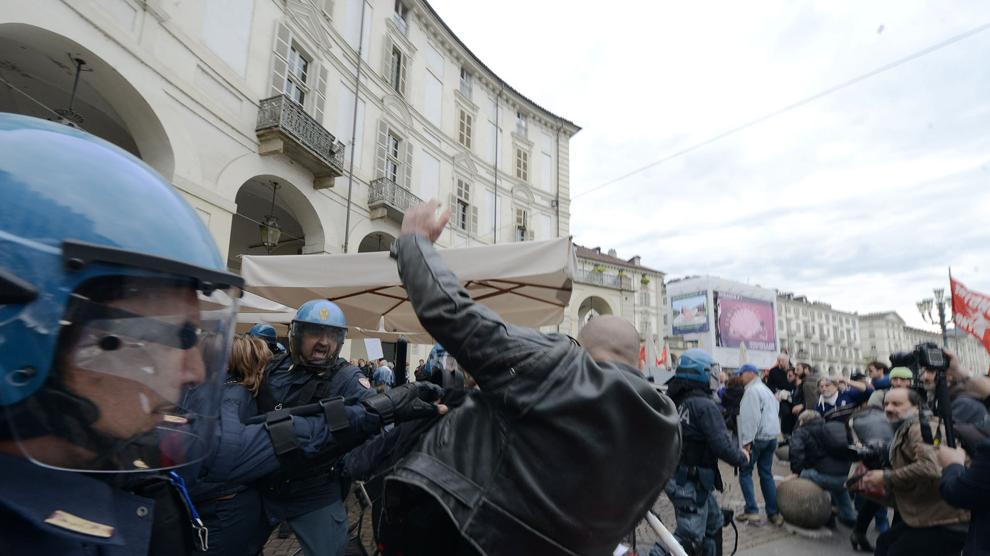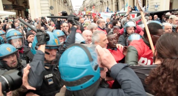 La coda del corteo, dove sono presenti antagonisti e No Tav, sta seguendo la manifestazione ufficiale lungo via Po. A dividere i due gruppi, che sono ora distanti una cinquantina di metri l’uno dall’altro, resta un nutrito dispositivo di forze dell’ordine. Che dopo poco sono ancora dovute intervenire con una carica di alleggerimento nei confronti di antagonisti e No Tav. Lo “spezzone sociale”, infatti, ha tentato di forzare in via Roma il cordone di sicurezza, ma sono stati respinti. i. Antagonisti e No Tav, poi, sono stati allontanati dal cuore del corteo. La tensione resta alta. “Vergogna vergogna” e “corteo” alcuni degli slogan urlati. Antagonisti e No Tav, infine, hanno raggiunto il palco di piazza San Carlo e, a comizi conclusi, hanno rimosso i palloncini e le bandiere.