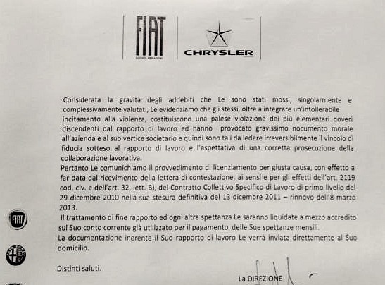 Dopo il dietro front sul trasferimento di 500 operai cassintegrati da Mirafiori alla Maserati di Grugliasco, Sergio Marchionne torna a usare il pugno di ferro. E i lavoratori rispondono con la proclamazione di un nuovo sciopero. Martedì quattro operai in cig hanno ricevuto dal Lingotto una lettera di licenziamento per motivi disciplinari. L’azienda, secondo il Comitato di lotta cassintegrati e licenziati Fiat legato ai Cobas, contesta la loro partecipazione alle manifestazioni organizzate il 5 e 10 giugno davanti al polo logistico di Nola per chiedere il ritorno a Pomigliano degli oltre 300 lavoratori distaccati dal 2008 e da allora in cassa integrazione. Proteste durante le quali sono comparsi un manichino impiccato con la foto dell’amministratore delegato incollata al posto del volto e una finta bara, a inscenare una veglia funebre. Un modo, sostengono gli operai, per ricordare i suicidi e tentati suicidi di alcuni lavoratori in cassa integrazione e gli incidenti sul lavoro avvenuti in azienda. Ma secondo Fiat quelle scene, avvenute “alla presenza di giornalisti e fotografi di varie testate che ne hanno dato ampia diffusione”, integrano “un’intollerabile (sic) incitamento alla violenza” e “costituiscono una palese violazione dei più elementari doveri discendenti del rapporto di lavoro”. Non solo: hanno “provocato gravissimo nocumento morale all’azienda ed al suo vertice societario”. Di qui la decisione di licenziare per giusta causa i quattro dipendenti. Quelli che, stando alla lettera, hanno materialmente allestito il finto patibolo e il finto funerale.