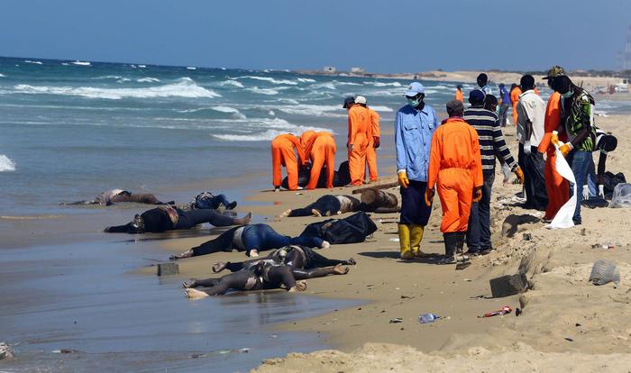 I corpi senza vita di uomini, donne e bambini su una spiaggia libica