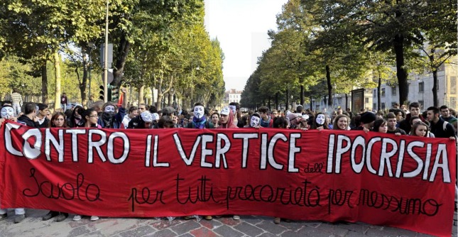 Continuano gli scontri a Torino: cinque fermi e tre poliziotti feriti al corteo della Fiom organizzato dal sindacato per protestare contro il Jobs act e contro il vertice Ue sul lavoro in programma al Teatro Regio.