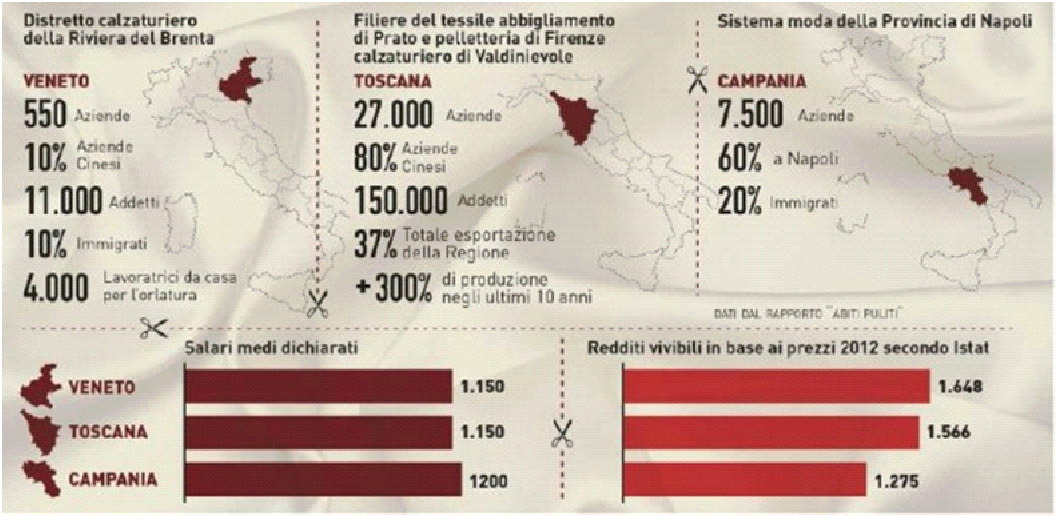 Gli asiatici in Toscana producono  per i big della moda – In Toscana, nel distretto tessile di Prato, l’80% delle imprese è a conduzione cinese. Una “filiera nella filiera”, portata alla luce dopo l’incendio del dicembre 2013, senza permessi di soggiorno, con rapporti di lavoro irregolari, pagamenti in nero, evasione fiscale, orari di lavoro prolungati, luoghi insalubri. Ma il dato che stupisce è che l’allarme del mondo imprenditoriale è stato lanciato solo quando le ditte cinesi sono uscite dal loro tradizionale ruolo di terziste per assumere il controllo di tutte le fasi, dalla produzione alla distribuzione. Già nel 2003, uno studio di Antonella Ceccagno sul distretto tessile multietnico toscano sottolineava come, tra gli imprenditori cinesi subfornitori di aziende italiane, i nomi più citati fossero quello di Armani, Ferré, Valentino, Versace e Max Mara. Giovanna, che invece è italiana, racconta nel rapporto: “Cucivo le tomaie da casa a mano, con ago e filo. Io e mio figlio facevamo 20-30 paia al giorno. Mi pagavano al paio. In nero. Ti svegliavi alle 6 del mattino e fino alla sera tiravi tutto il giorno il filo. Perché devi fare questo movimento, così – racconta mimando il gesto – Per tutto il giorno, per prendere poi alla fine del mese 500, 600 euro”.