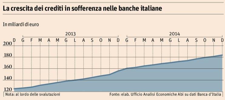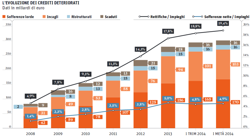 Se poi si guarda a tutti i crediti deteriorati rispetto al totale dei crediti concessi si è passati dal 5% di prima della crisi nel 2008 al 20% di oggi, una enormità che i banchieri si aspettano in crescita anche per tutto il 2015 e ciò non può che preoccuparli.