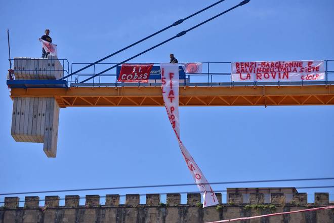 invio dalla rete la notizia che d’all’alba di ieri cinque operai licenziati dalla Fiat di Pomigliano sono saliti sulla gru più alta del cantiere della metropolitana di Napoli, piazza municipio. Sono vittime dei licenziamenti discriminatori, del Mobbing attuati da Marchionne. Relegati al reparto confino di Nola. Alcuni compagni si sono suicidati per la disperazione. I lavoratori resteranno sulla gru, mentre altri compagni hanno montato una tenda per appoggiare la protesta. Sandro Fucito, Elena Coccia, Peppe Rinaldi, Arnaldo Maurino, Tommaso Sodano, Parisi Gaetano, Troncone Gennaro, Esposito Francesco, Vernetti Carmine, Sgambati Enrico, Panini Enrico, Cirio Borriello,