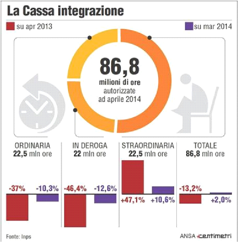 segnalo l’incremento della cassaintegrazione. Fa il paio con la notizia di ieri che denunciava il calo degli operai dell’industria. Ma Renzi e i suoi compari tagliaborse, continuano a dire che la ripresa è cominciata……..
