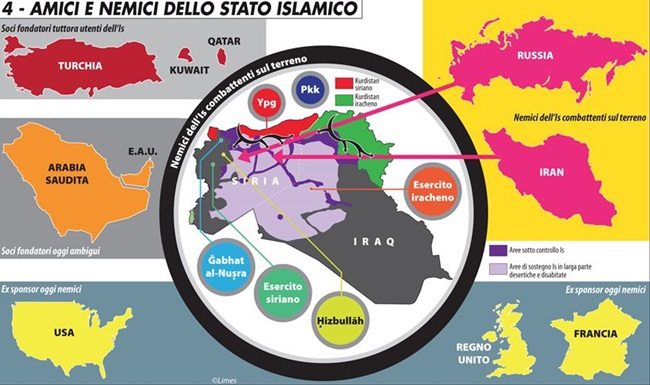 In questo caso l’Is non è il soggetto più odiato, e neppure più combattuto. Nella carta di Limes lo schieramento in campo tra chi combatte l’Is, chi non lo combatte (o solo apparentemente) e chi anzi lo aiutava.