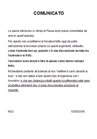 La reazione della RSU alle forzature dell’azienda sulle pause
