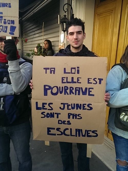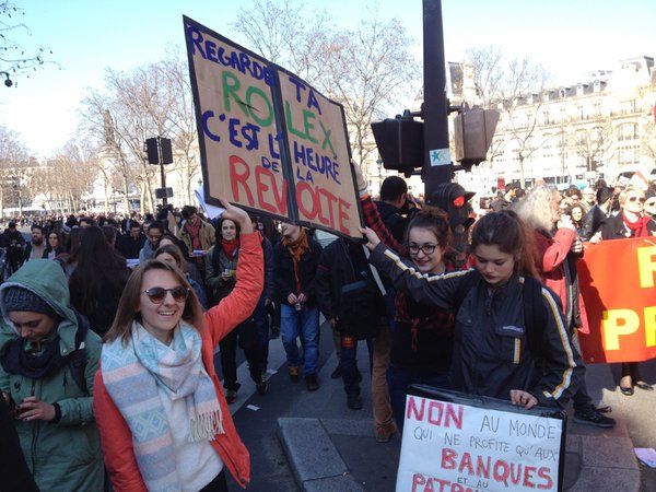Dati gli argomenti la protesta francese ha visto coinvolti oltre agli studenti anche i sindacati che nella manifestazione del 9 marzo hanno sfilato assieme. Poi sono venute alcune correzioni di facciata da parte di Hollande su suggerimento di alcuni sindacati accondiscendenti che ha diviso il fronte che si oppone alla legge. Ma solo in piccolissima parte quello degli studenti che infatti sono tornati giovedì scorso agguerriti per le strade di Parigi. Dagli slogans emerge una ribellione che travalica la legge in sé.