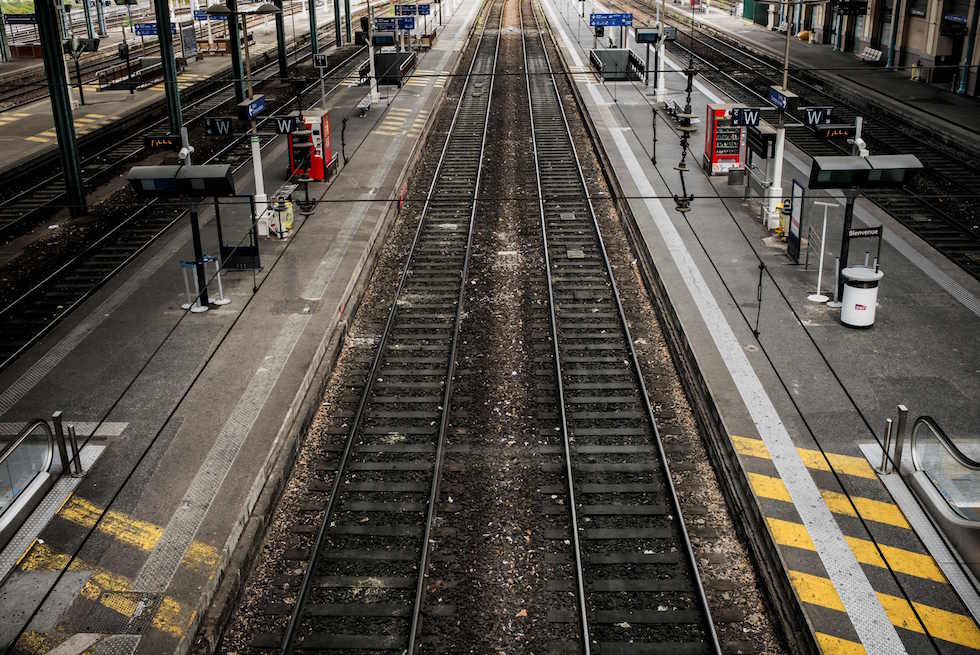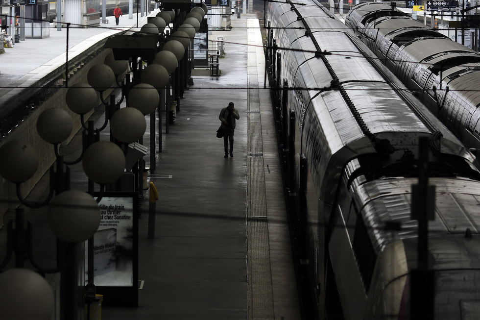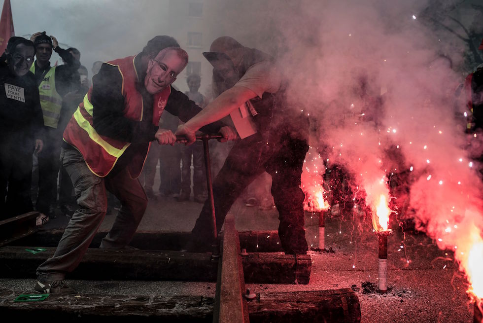 Un uomo con una maschera del presidente francese Francois Hollande e un altro con una maschera dell’amministratore delegato di SNCF Guillaume Peppy di fronte a una filiale della MEDEF (Mouvement des Entreprises de France, l’associazione dei datori di lavoro, una sorta di Confindustria francese) a Lione – 1 giugno 2016