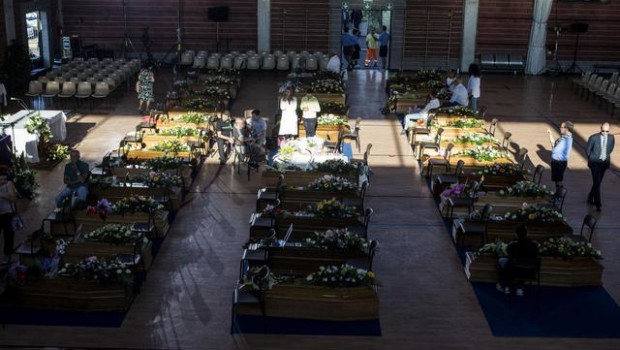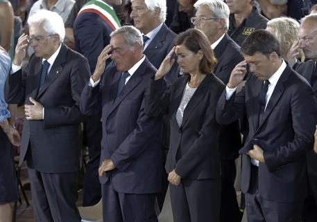 From left, Italian President Sergio Mattarella, Italian Senate President Pietro Grasso, Italian Lower Chamber President Laura Boldrini and Italian Premier Matteo Renzi attend the funeral service of some of the earthquake victims in Ascoli Piceno, Italy, Saturday, Aug. 27, 2016. (ANSA/AP Photo/Andrew Medichini) [CopyrightNotice: Copyright 2016 The Associated Press. All rights reserved. This material may not be published, broadcast, rewritten or redistribu]