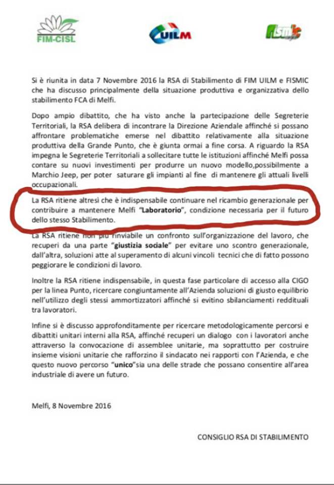 Ora la RSA ( FIM-CISL, UILM, FISMIC) chiede il ricambio generazionale. Sanno bene che a Melfi non ci sono operai in procinto di pensionamento nello stabilimento.. Probabilmente il ricambio è per eliminare gli operai combattivi e fornire carne fresca  al mattatoio padronale.