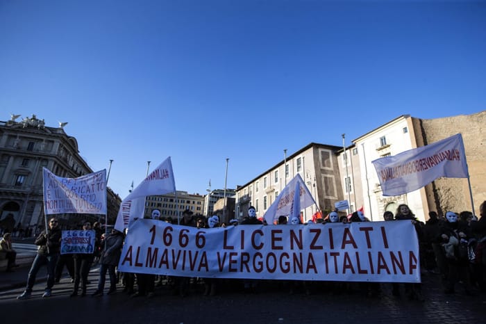 “Chiediamo ammortizzatori adeguati e una ricollocazione nel mondo del lavoro per non perdere il nostro precedente inquadramento”. Sono queste le richieste dei lavoratori di Almaviva, scesi oggi in piazza per chiedere certezze sul loro futuro dopo il licenziamento di 1.666 dipendenti dell’azienda di call center della sede romana.