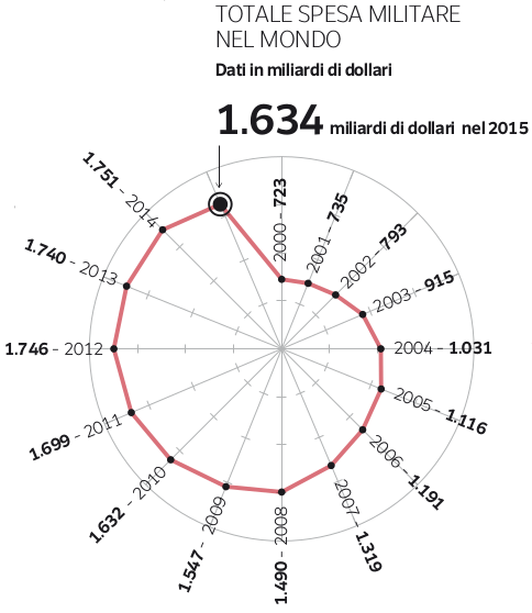 Porto all’attenzione dei lettori di Operai Contro un articolo di qualche settimana fa del Corriere della sera (La Lettura del 29 gennaio 2017 pag. 12 e 13) sull’aumento delle spese militari degli ultimi anni, corredato da grafici e dati interessanti.