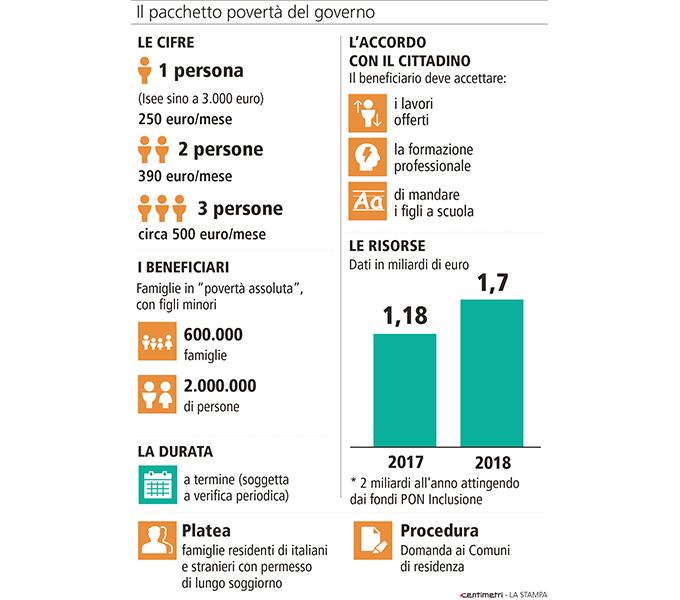 Sul piatto ci sono risorse importanti già indicate nel Def: complessivamente si parla di 1,18 miliardi per il 2017 e di 1,7 miliardi per il 2018. In realtà, attingendo ai fondi Pon Inclusione che serviranno a rafforzare i servizi territoriali a cui sarà affidata la presa in carico delle famiglie, si arriverà a impegnare 2 miliardi di euro all’anno.