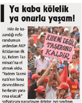 Hile ile kazandığı referandumun ardından AKP iktidarının ilk işi, Kıdem Tazminatı’na el atmak oldu. “Kıdem Tazminatı’nın fona devredilmesi herkesin yararına olacak” safsatasını pazarlayan iktidar, işçi sınıfının elinde kalan bu son hakkın da ruhuna fatiha okumaya hazırlanıyor. Kıdem Tazminatı’nın fona devredilmesi ile işçi sınıfı kaybedecek, patronlar rahatlayacak, hükümet ise istediği zaman yağmalayabileceği yeni bir fona kavuşmuş olacak…