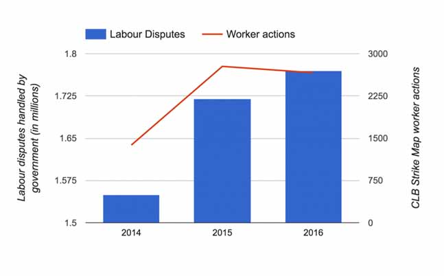 Aumento del conflitto operaio: vertenze dii lavoro (fonte: statistiche governative) proteste indipendenti degli operai (fonte CLB mappatura degli scioperi).