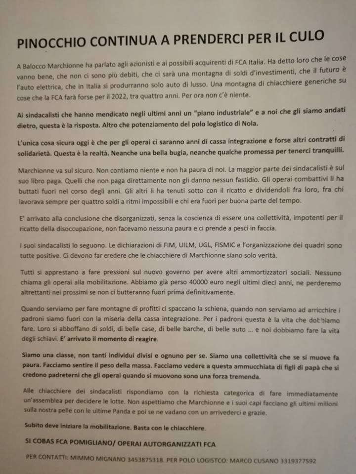 Gli operai autorganizzati FCA, stanno tentando con ogni mezzo di far riprendere l’iniziativa degli operai (alleghiamo volantino distribuito a Pomigliano l’altro ieri).