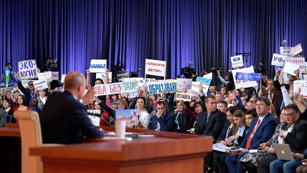 Il 20 dicembre si è svolta la rituale conferenza stampa di fine anno del Presidente della Russia, Vladimir Putin. In un clima da stadio, 1700 giornalisti da tutto il mondo, è stata l’occasione per il nuovo zar della borghesia russa per dire a tutte le altre quanto lo stato geograficamente più grande del pianeta sia anche una potenza rilevante per risorse ed economia. Non sarà l’Urss della Guerra Fredda, ma la Russia rimane la seconda potenza nucleare, che non possono permettersi di sottovalutare militarmente. Nel recente passato lo ha anche praticamente dimostrato sia contro l’Ucraina con l’annessione della Crimea e nessuno ha osato dire nulla, sia in Siria dove con l’appoggio ad Assad ha ristabilito il suo avamposto militare nel Medio Oriente e nel Mediterraneo.