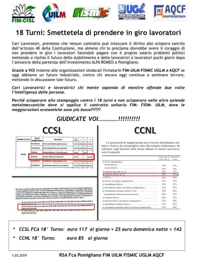 Volantino distribuito il 1° marzo dai delegati Fim della Fiat di Pomigliano, durante il cambio turno: