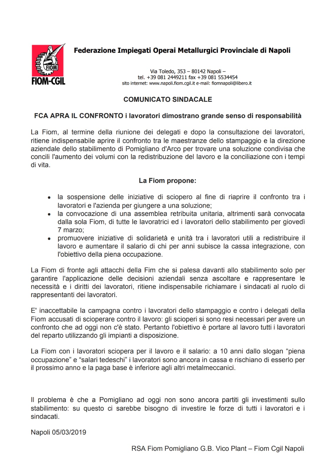 FCA POMIGLIANO. LA FIOM VUOLE FERMARE GLI SCIOPERI Posted by Operai Contro 7 Marzo 2019 Nel comunicato è scritto espressamente: “La sospensione degli scioperi al fine di aprire il confronto…” Condividi sui social: