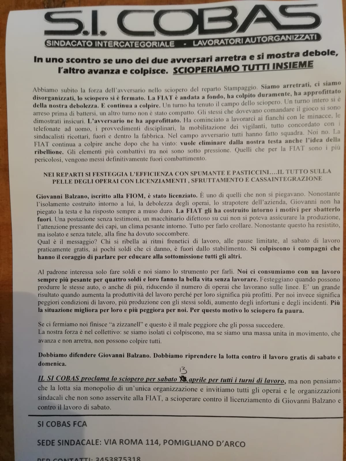 FCA POMIGLIANO, CONTRO IL LICENZIAMENTO PER RAPPRESAGLIA DI GIOVANNI BALZANO Posted by Operai Contro 11 Aprile 2019 Volantino distribuito il 9 aprile ai cancelli dello stabilimento Fiat Giambattista Vico di Pomigliano Condividi sui social: