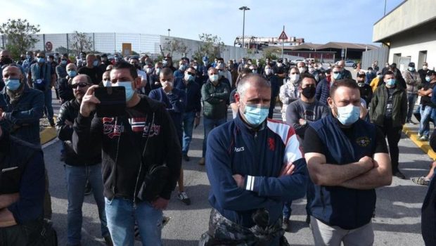 il sit-in degli operai di Taranto davanti alla Prefettura, mentre
