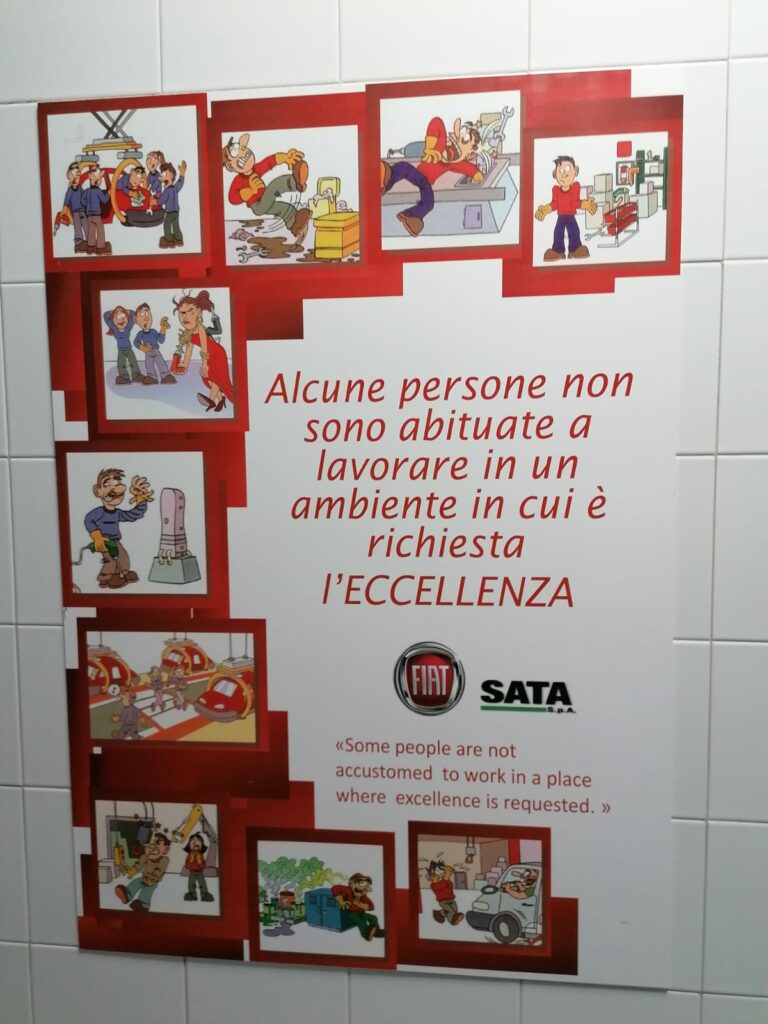 Vogliamo soffermarci però su un più recente esempio di questa attitudine padronale a dileggiare gli oppressi. Nell’infermeria dello stabilimento FCA di Melfi, ben in mostra, incollato alla parete, spicca il manifesto che riportiamo di seguito. Al centro di esso si legge, scritta in grande, la frase lapidaria: “Alcune persone non sono abituate a lavorare in un ambiente in cui è richiesta l’eccellenza”. Fanno da cornice ad essa una serie di vignette, ciascuna delle quali rappresenta un possibile incidente. Dalle vignette si capisce che l’intento è di attribuire la responsabilità di questi ipotetici incidenti agli operai stessi, colpevoli di comportamenti sbagliati, o distrazione, o mancata cura della pulizia della postazione, o fretta, o noncuranza dei segnali di avvertimento, ecc. Una delle vignette è particolarmente odiosa. Vi si rappresenta una operaia che si è fatta male perché, invece di indossare la tuta di ordinanza, si è presentata per pavoneggiarsi al lavoro con vestito lungo e tacchi a spillo. Riportiamo qui di seguito anche le singole vignette ingrandite. Vogliamo però nel merito fare due considerazioni. La prima è che l’infermeria è il luogo in cui, in genere, vengono fornite agli operai le prime cure nel caso di incidenti. Certo non deve essere bello per loro essere accolti subito in questo modo. L’azienda dice subito quale è il suo pensiero: se ti sei fatto male è colpa tua e questo mi dimostra che non sei “eccellente” come noi pretendiamo. A Napoli si dice cornuti e mazziati. La seconda è che questa versione aziendale sulla sicurezza in fabbrica è del tutto falsa, sia perché le norme di sicurezza degli impianti non riescono mai a rendere uguale a zero i rischi, sia perché le eventuali “distrazioni” non sono dovute a negligenza ma agli stessi eccessivi ritmi di lavoro, sia perché la stessa magistratura, restia in genere ad ascoltare le ragioni operaie, si è pronunciata in alcuni casi, sanzionando la responsabilità aziendale per degli incidenti. Si pensi alla condanna in Corte di Appello che la FCA di Melfi ha subito per l’incidente del 25 marzo 2008, che è costata la vita all’operaio Monopoli Domenico. I giudici hanno riconosciuto la condotta omissiva della suddetta azienda nella predisposizione delle misure di sicurezza imposte dalla legge.
