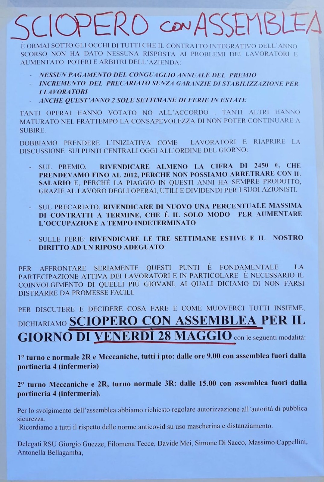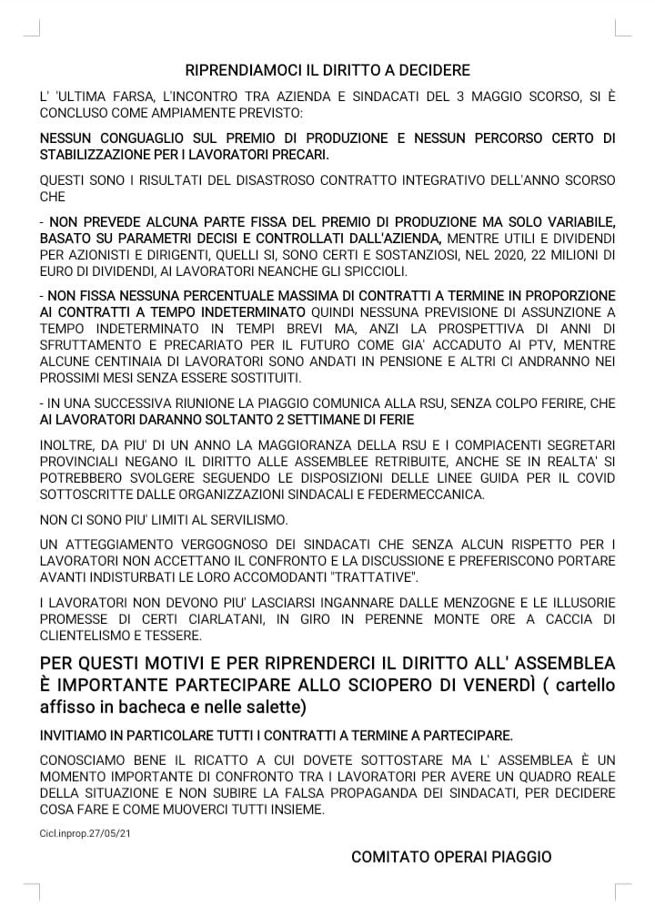 Da un anno la maggioranza RSU, coperta dai segretari provinciali, impedisce lo svolgimento delle assemblee. I delegati operai non ci stanno ed organizzano uno sciopero con assemblea, nessuno può impedire agli operai di riunirsi per discutere dei loro problemi. Comunicati sindacali.