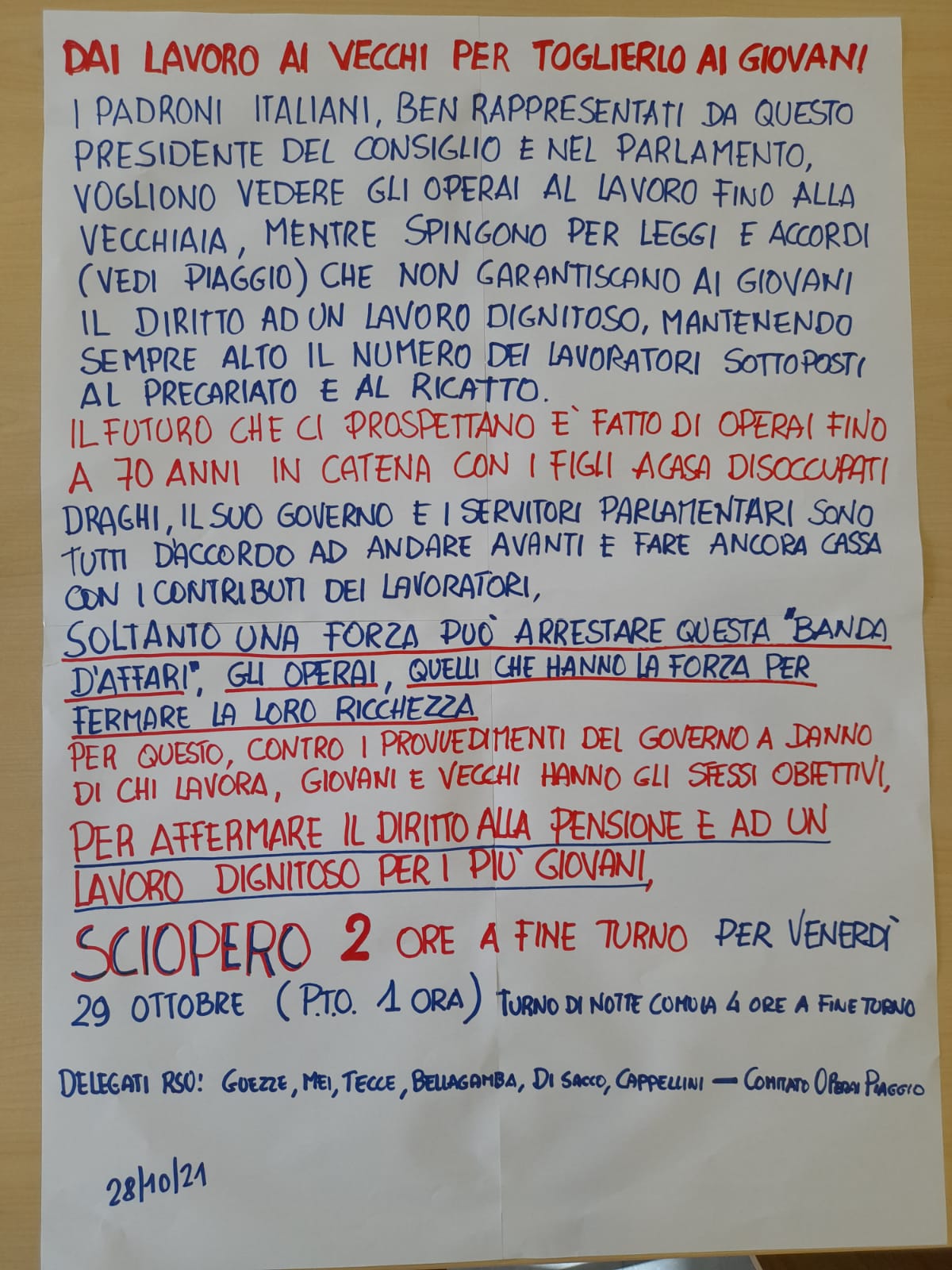 ALLA PIAGGIO SULLE PENSIONI SI SCIOPERA Posted by Operai Contro 28 Ottobre 2021 Gli operai intervengono contro le manovre per allungare l’età pensionabile e rendere più ricattabili i giovani al lavoro. Venerdì due ore di sciopero Condividi sui social: