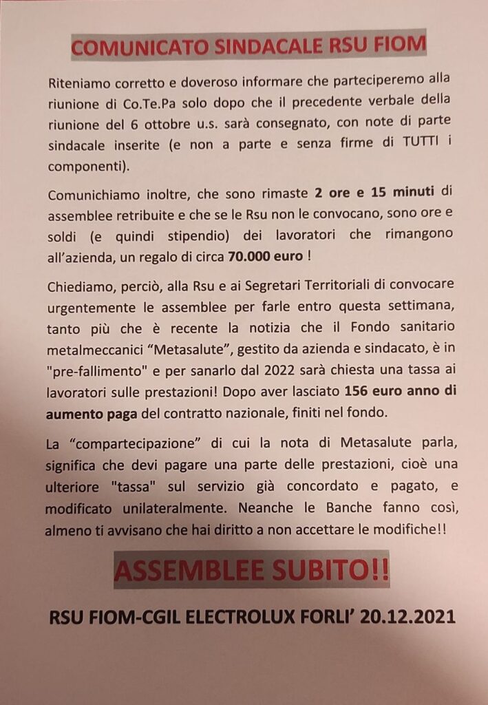 Electrolux, Forlì, comunicato della RSU FIOM. Per risanare il bilancio del fondo sanitario metalmeccanici sarà chiesta una tassa sulle prestazioni. Assemblee subito prima che le misure diventino operative