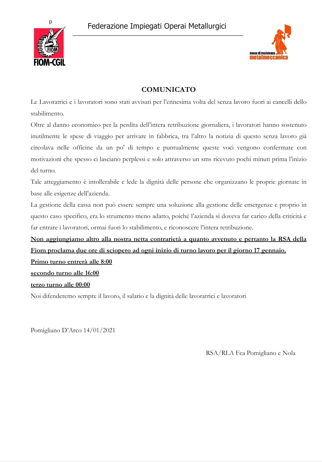Questa è l’organizzazione della quarta casa automobilistica al mondo? Questo è il suo modo di trattare i suoi dipendenti? Beh, non avevamo dubbi, RISPETTO pari a zero. In questo periodo, inoltre, c’è l’aggravante che diverse lavoratrici e lavoratori sono costretti ad effettuare un tampone a proprie spese, per recarsi a lavoro. Avvisati così, del senza lavoro, significa oltre al danno la beffa. Ad accompagnare, come al solito, ormai non è una novità, le scellerate scelte padronali, i soliti bidelli di cui sopra. La risposta però, questa volta arriva dalla Fiom e non si fa attendere. Nel ricordarsi di fare sindacato, proclama due ore di sciopero al primo giorno di rientro previsto per lunedì e poi spostato a martedì 18 gennaio 2022.