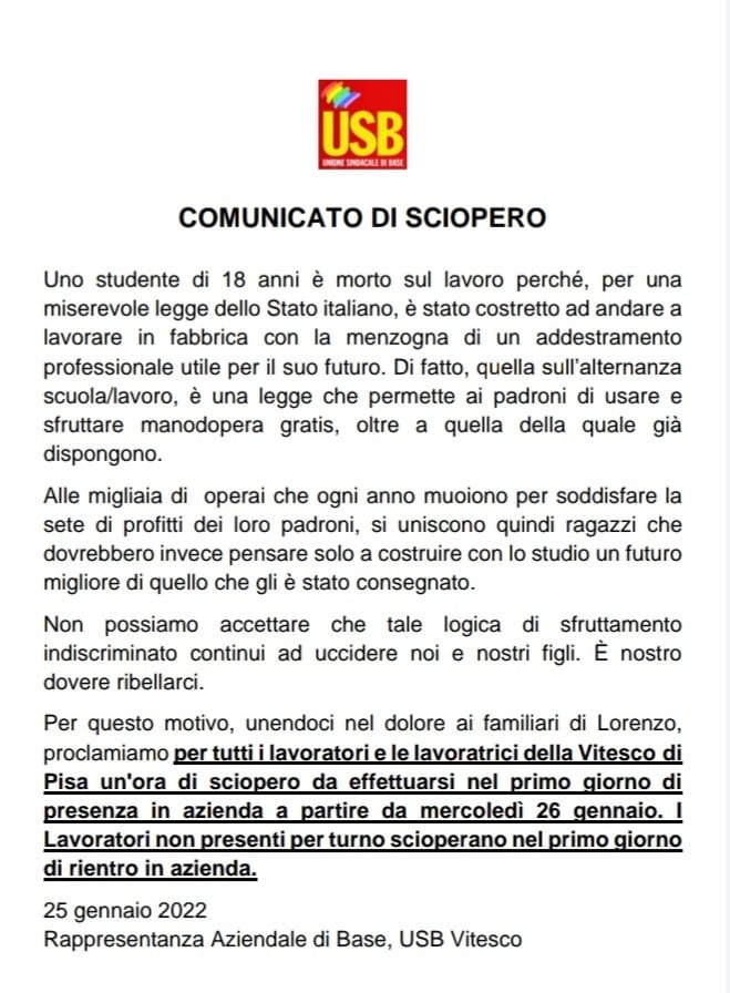 VITESCO, Pisa. Comunicato di sciopero della rappresentanza di base USB. E' necessario che gli operai scendano in campo a fianco della gioventù costretta a lavorare e perdere la vita sotto la copertura dell'alternanza scuola-lavoro.