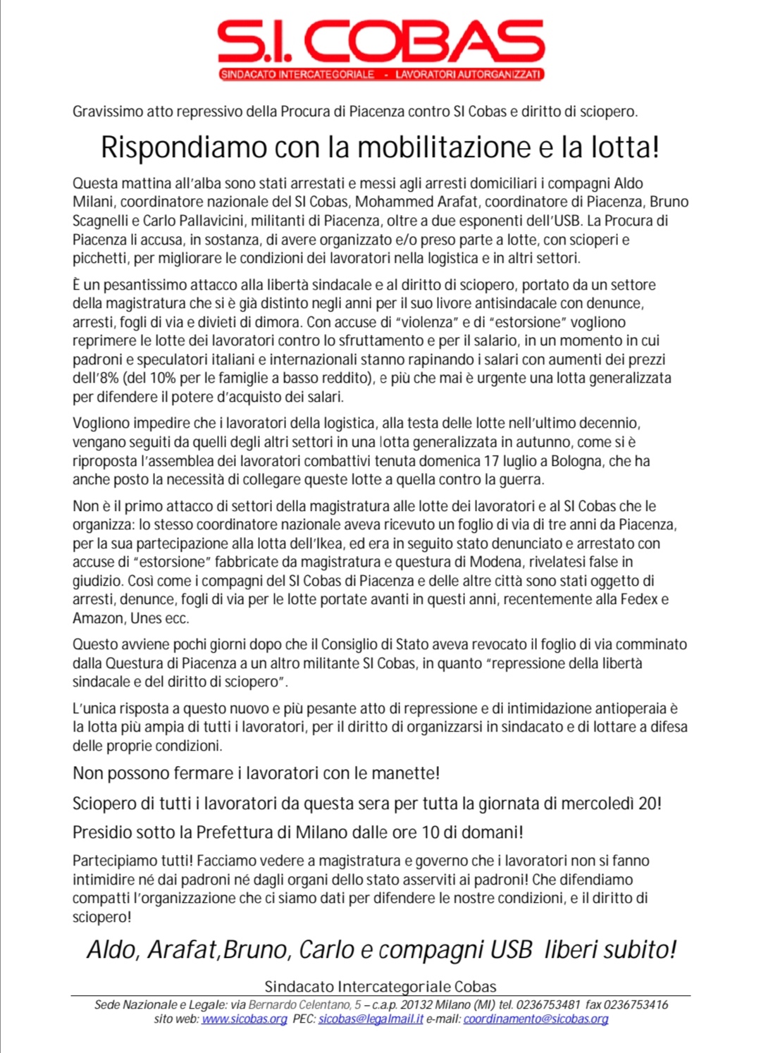 Piacenza, arresti domiciliari per 6 sindacalisti di Si Cobas e Usb, tra loro c’è il coordinatore nazionale del SI COBAS Aldo Milani, e quello provinciale di Piacenza Mohammed Arafat, accusati di associazione a delinquere.