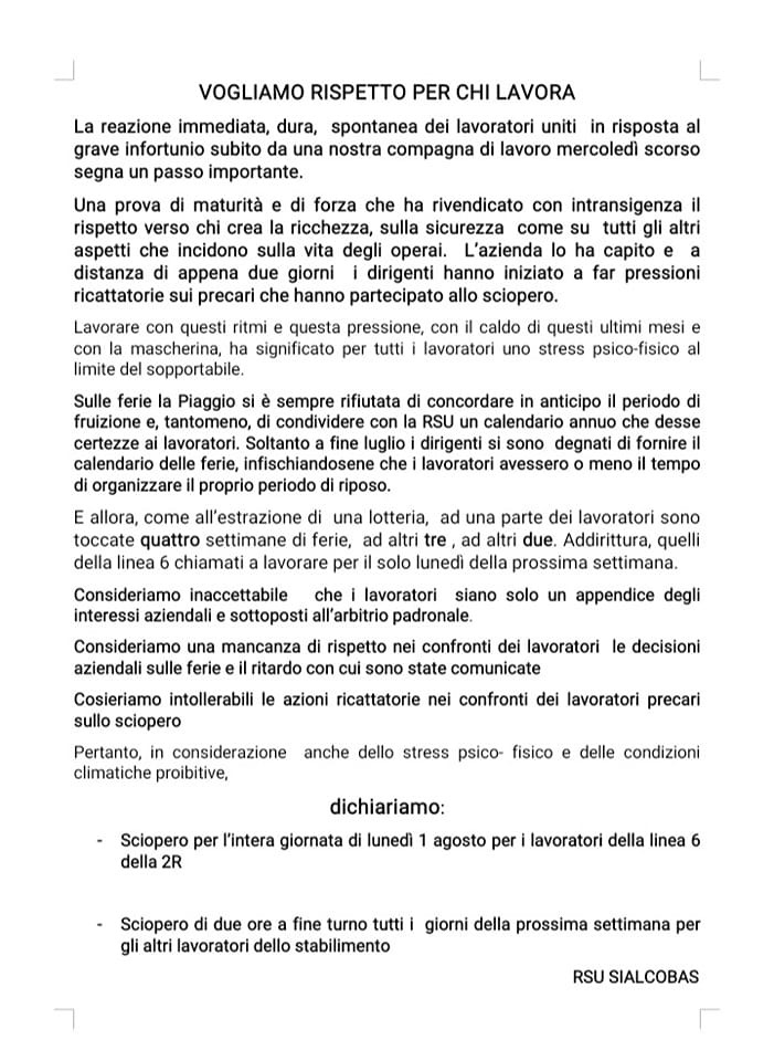Sulle ferie la Piaggio si è sempre rifiutata di concordare in anticipo il periodo di fruizione e, tantomeno, di condividere con la RSU un calendario annuo che desse certezze ai lavoratori. Soltanto a fine luglio i dirigenti si sono degnati di fornire il calendario delle ferie, infischiandosene che i lavoratori avessero o meno il tempo di organizzare il proprio periodo di riposo.