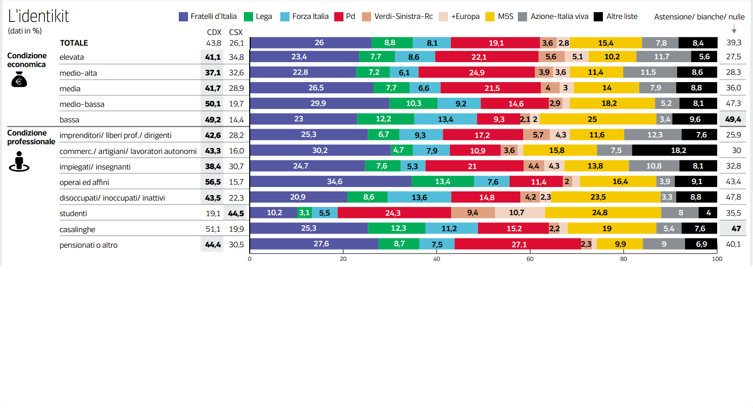 Il Corriere della Sera del 28 settembre ha pubblicato un articolo, tratto da un’indagine del centro studi Ipsos sui flussi elettorali, dove risulta in modo incontrovertibile che lo strato sociale che ha espresso più consensi al partito della Meloni, partito di destra parlamentare, di tradizione fascista, sia quello degli operai ed affini. E’ strano ma comprensibile che ad ogni elezione si senta il bisogno di catalogare gli operai prima come berlusconiani, poi leghisti ed ora seguaci della Meloni, fa piacere ai vecchi ed ai nuovi rappresentanti dei borghesi fregiarsi dell’appoggio del nemico storico finalmente normalizzato, serve ai “sinistri” per giustificare il loro fallimento addebitandolo agli operai ormai scivolati a destra.