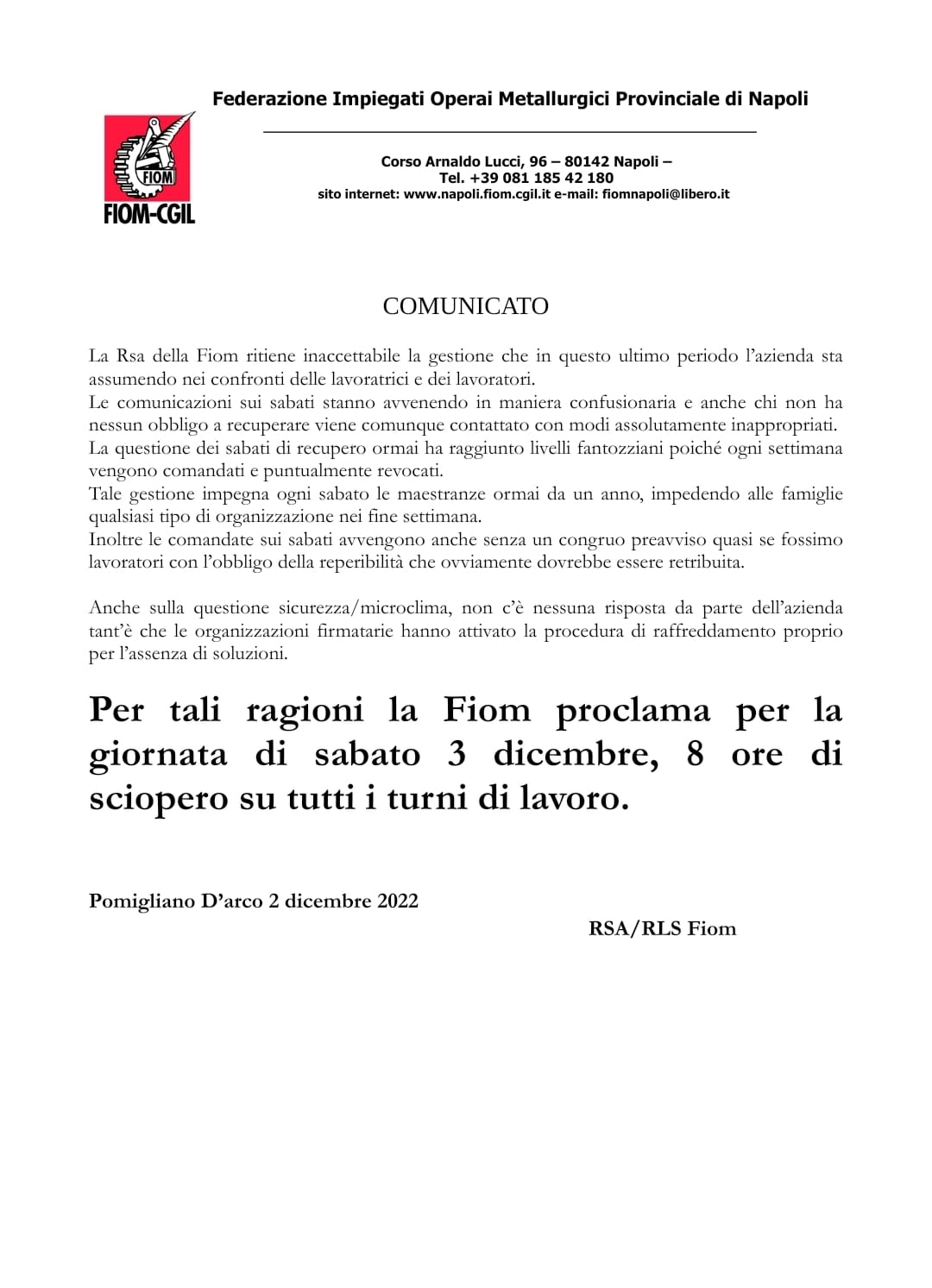 Il 2 dicembre, meglio tardi che mai, la Fiom proclama 8 ore di sciopero (vedi comunicato in allegato) per il sabato 3 dicembre, ritenendo inaccettabile il comportamento dell’azienda.