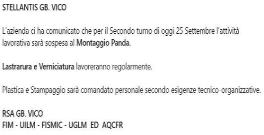 La goccia che ha fatto traboccare il vaso è stata la comunicazione fatta mercoledì 25 settembre. Un’oretta prima dell’inizio del turno di lavoro, quando molti di noi erano già in viaggio per arrivare in fabbrica, siamo stati avvisati dai soliti sindacalisti firmatutto, che si limitano sempre a fare i passacarte dell’azienda, che “l’attività lavorativa sarà sospesa”, senza la motivazione e senza neanche informarci sulla copertura salariale. Nulla di nuovo, come in molti ricordano, considerando che sono anni che questo atteggiamento viene adottato dal padrone ma questa volta ad essere diverso, è l’atteggiamento degli operai. Giovedì al rientro in fabbrica l’incazzatura la si sentiva già fuori ai cancelli e cresceva sempre di più con l’ingresso nei reparti e quando poi è iniziato il turno di lavoro a ricordarci anche l’inferno che subiamo lavorativamente parlando, abbiamo agito come una collettività costringendo, quindi, a far fare il proprio ruolo anche al sindacato e così la Fiom ha dato copertura ad uno sciopero riuscitissimo. Un’ora di sciopero per la nostra DIGNITÀ e per dire che questo è solo l’inizio.