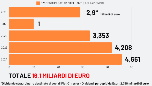 Stellantis ha distribuito 24 miliardi di euro in dividendi agli azionisti negli ultimi quattro anni. Soldi prodotti dagli operai sulle linee che sono serviti per far fare la bella vita ai proprietari delle azioni Stellantis. In primis, la famiglia Agnelli-Elkann.