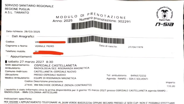 Emblematica è la condizione degli operai di Acciaierie d’Italia, l’ex Ilva, costretti a lavorare in fabbriche dove il rischio di malattia professionale, di infortunio e di morte è altissimo. Esemplare il caso di Piero Vernile, operaio dello stabilimento siderurgico ex Ilva di Taranto, che avverte dolori alla schiena: vista l’attività che svolge il medico gli ha prescritto una risonanza per capirne la causa. L’operaio si è recato a un Centro unico prenotazione (Cup) per fissare una risonanza magnetica senza contrasto al rachide dorsale e ha ottenuto il primo accesso al 27 marzo 2027 all’ospedale di Castellaneta (Ta)!